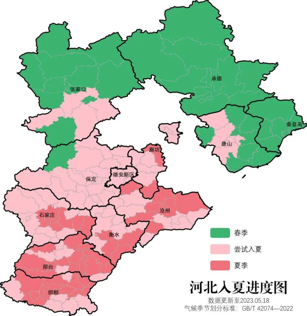 截至5月18日,河北省中南部地区正在尝试翻越夏天的门槛(图中粉色区域),其中40个县(市、区)已进入气象意义的夏季(图中红色区域)。