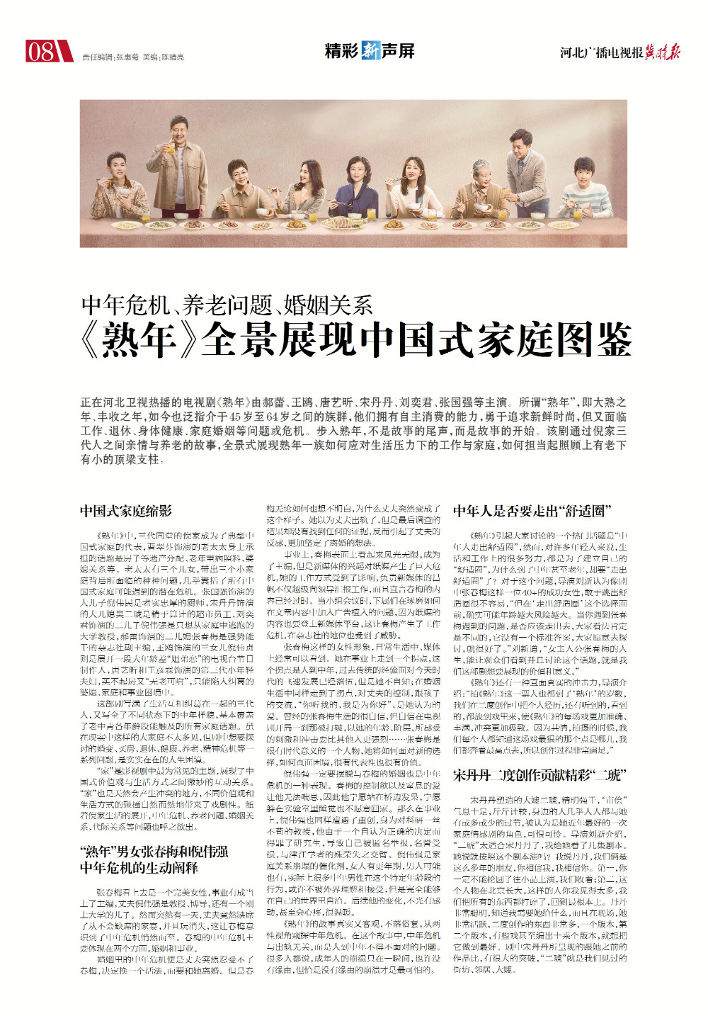 国+社区新媒体报道 由郝蕾、王鸥、唐艺昕、宋丹丹、刘奕君、张国强等主演的电视剧《熟年》8月18日河北卫视黄金剧场开播。所谓“熟年”,即大熟之年、丰收之年,如今也泛指介于45岁至64岁之间的族群,他们拥有自主消费的能力,勇于追求新鲜时尚,但又面临工作、退休、身体健康、家庭婚姻等问题或危机。步入熟年,不是故事的尾声,而是故事的开始。该剧通过倪家三代人之间亲情与养老的故事,全景式展现熟年一族如何应对生活压力下的工作与家庭,如何担当起照顾上有老下有小的顶梁支柱。