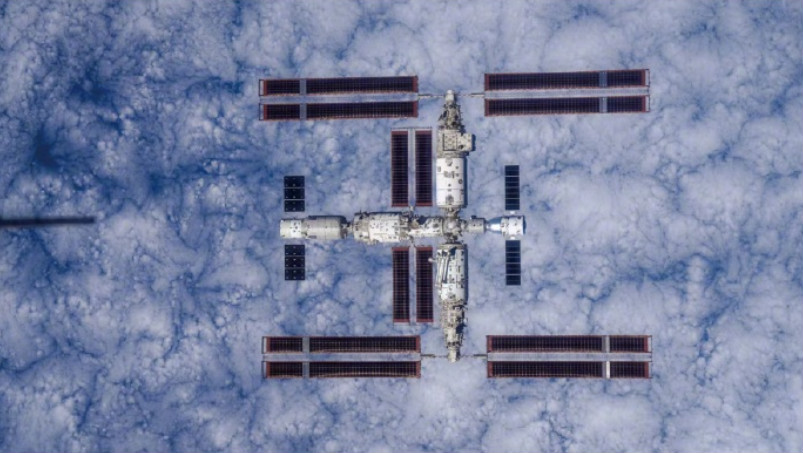 中国空间站全貌高清图首次公布28日,载人航天工程代表团抵达香港,开启对港澳为期6天的访问。媒体见面会上,首次发布了神舟十六号乘组返回地面前手持高清相机通过飞船绕飞拍摄的空间站组合体全景照片。这是我国首次在轨获取以地球为背景的空间站组合体全貌图像,也是中国空间站的第一组全构型工作照。