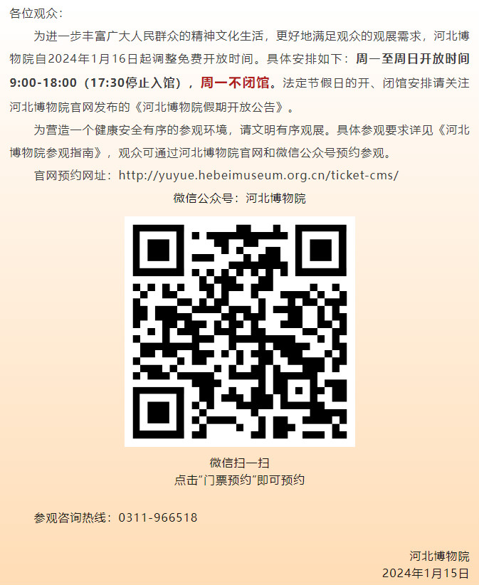 河北博物院调整免费开放时间,9时至18时开放,周一不闭馆。观众可通过河北博物院官网和微信公众号预约参观。