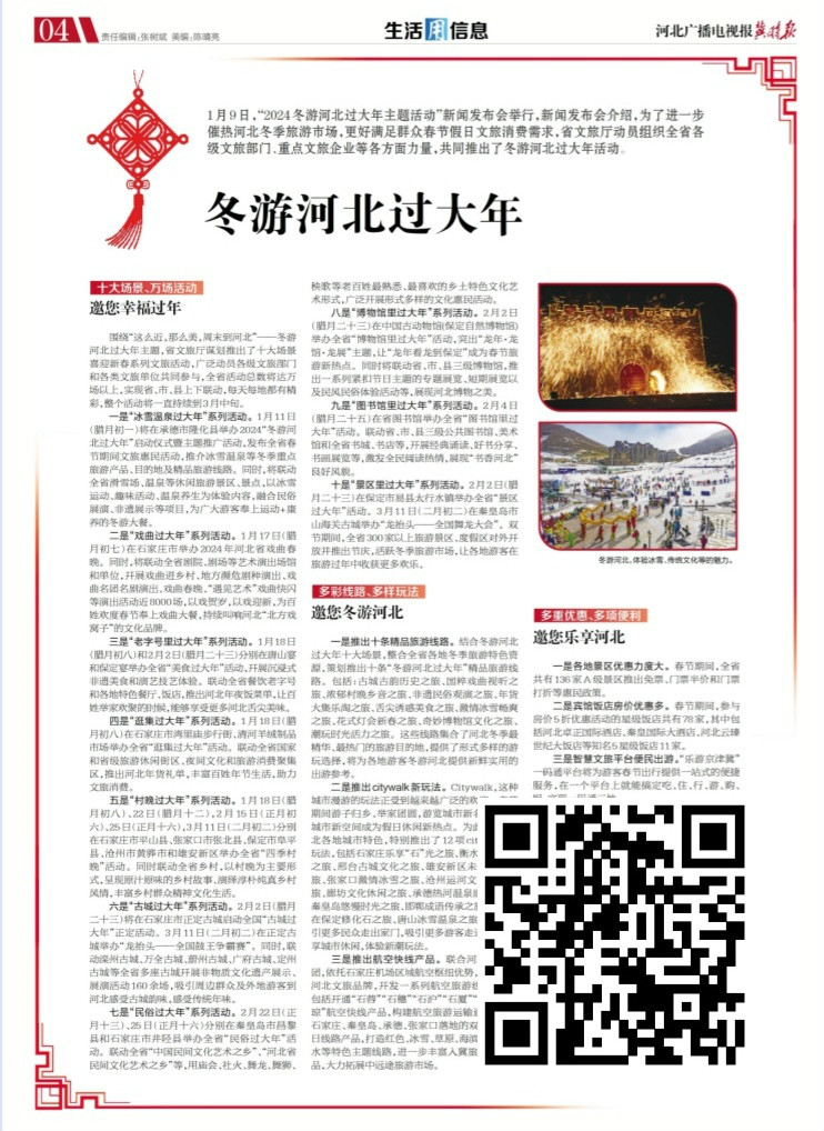 冬游河北过大年 万场活动等你来 ! 为了进一步催热河北冬季旅游市场,更好满足群众春节假日文旅消费需求,省文旅厅动员组织全省各级文旅部门、重点文旅企业等各方面力量,共同推出了冬游河北过大年活动。主要内容包括(识别图片上的二维码关注阅览)。