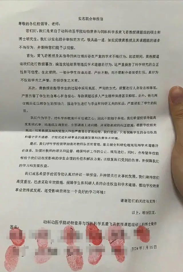 华中农大回应教师被举报学术造假 16日,华中农业大学有学生联名实名举报黄姓导师学术造假,还有压榨学生等有违师德的行为。华中农业大学动物科学技术学院/动物医学院发布说明:16日,学院立即成立工作专班,启动调查程序。学院始终坚持师德师风第一标准,对学术不端行为零容忍,将依据调查结论按规定做出处理。