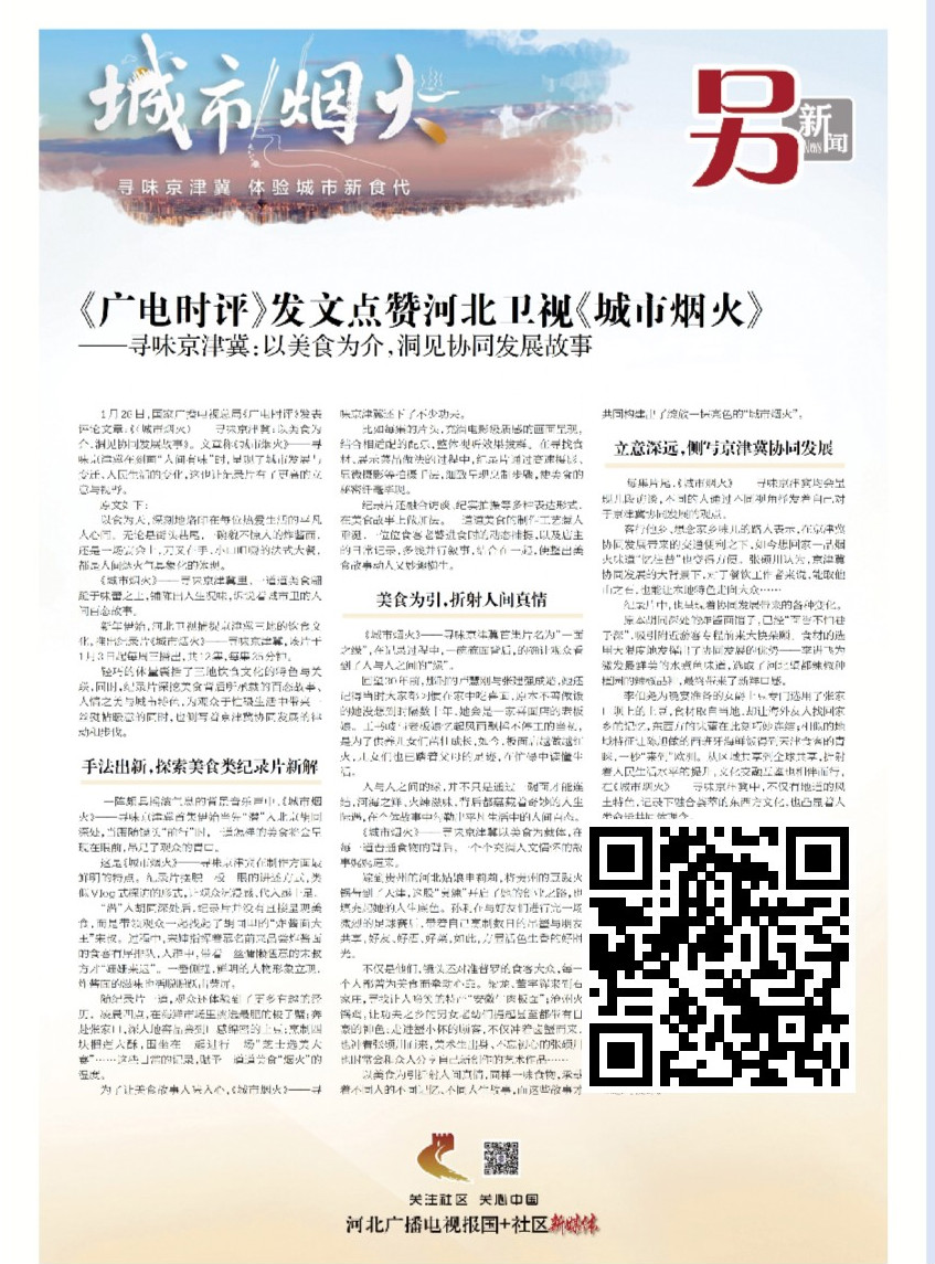 河北卫视《城市烟火》——寻味京津冀:以美食为介,洞见协同发展故事 近日,国家广播电视总局《广电时评》发表评论文章:《〈城市烟火〉——寻味京津冀:以美食为介,洞见协同发展故事》。文章称《城市烟火》——寻味京津冀在刻画“人间有味”时,呈现了城市发展与变迁、人民生活的变化,这也让纪录片有了更高的立意与视野(识别图片上的二维码关注阅览)。