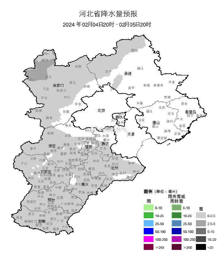 河北的大雪要“爽约”了 据最新研判,河北2月4-5日降雪强度、影响区域均有所减弱,主要降雪时段为4日下午到夜间,张家口、承德西部和保定、廊坊及以南地区有小雪或零星小雪(0.1~2毫米),其中张家口的部分地区和邢台东部、邯郸南部的个别地点有小到中雪(2~4毫米)。石家庄今天小雪转阴,-4°C~0°C;雄安新区阴,-7°C~2°C;北京阴转小雪,-7°C~2°C。