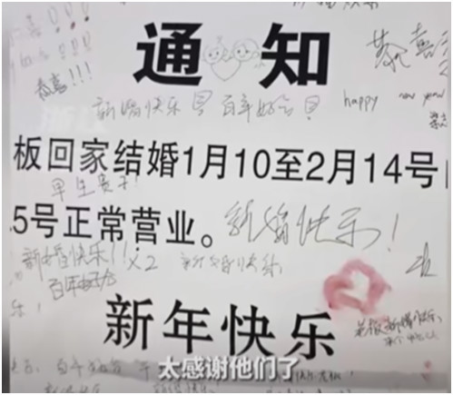 “因老板回家结婚1月10至2月14号闭店”,这张“请假条”火了 近日,浙江杭州一店主贴出回家结婚的休业告示:“因老板回家结婚,1月10至2月14号闭店,2月25号正常营业。”路人纷纷在告示上留言“新婚快乐”“白头偕老”“百年好合”,增添了不少喜气。店主表示很感动,“杭州太暖了”。