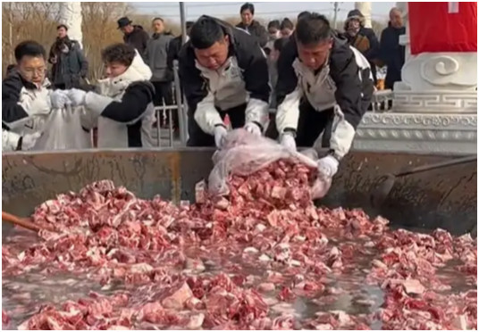 内蒙古3.9米大锅煮30只羊1200斤肉 日前,在内蒙古巴彦淖尔乌拉特后旗,乌盖蒙餐冰煮羊下锅了!3.9米大锅煮了30只羊、1200斤肉,围观市民排队等候品尝。网友:我现在去能赶上吃肉不?