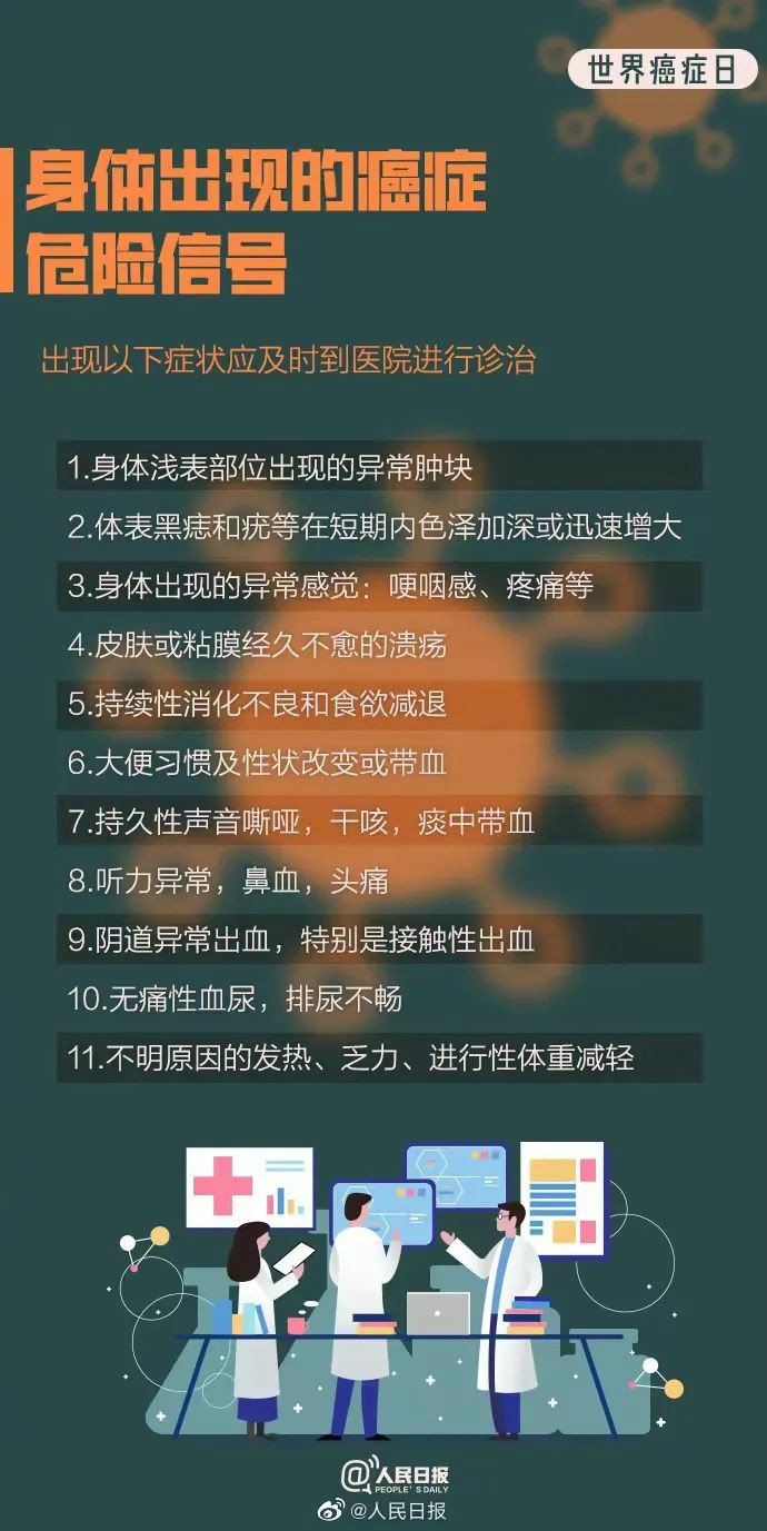 今天是世界癌症日,警惕身体发出的这些危险信号 2月4日是世界癌症日。根据世卫组织发布的信息显示:癌症是全世界主要死因之一。2020年近1000万例(或近六分之一)死亡由癌症导致。最常见的癌症是乳腺癌、肺癌、结肠癌、直肠癌、前列腺癌。1/3的癌症可以通过癌症筛查及早发现、明确诊断。