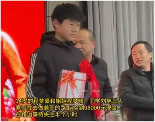 14岁男孩捡9万8千元,校长开千人大会表彰 日前,河南驻马店一中学召开全校大会,表扬8年级学生程梦豪拾金不昧的事迹。原来,就在过年前,程梦豪和姐姐程梦晴,还有姐姐的同学刘旭一起回家的时候,捡到一个帆布袋,里面装满了成捆的现金,合计9万8千元。3人当即报警,并在雪中等待失主。半小时后,焦急的失主终于出现。在警察的见证下,他们将这袋现金一分不少地归还。