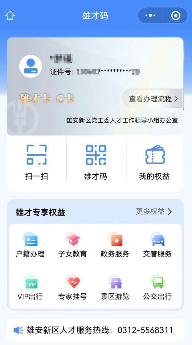 “雄才码”上线 “雄才码”和雄安人才智慧服务平台5月19日正式上线。近年来雄安新区全面实施“雄才计划”,累计为各类人才发放雄才卡1.1万余张,凭卡可按政策落户、购房,子女入学优先安排,享受教育医疗、交通出行、金融优惠等优质便捷服务。雄才卡持卡人可通过微信搜索“雄才码”小程序,实名认证登录后,在权益场景出示或扫一扫“雄才码”,无需实体卡,享受服务更便捷。雄安人才智慧服务平台集成各项人才服务,设置人才政策申报、求职招聘、新闻动态等6大模块,实现雄才卡、人才驿站、应届毕业生补贴等政策“一站式”申报。人才和用人单位可使用浏览器访问https://xatalent.cn/,注册登录后办理相关业务。