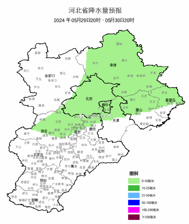 降水上线,谨防短时强降水等强对流天气 今天白天,张家口、承德和保定、石家庄、邢台、邯郸四个地区的西部多云转阴有雷阵雨或阵雨,局地有中到大雨,雷雨时伴有短时大风、短时强降水等强对流天气,其他地区晴转多云间阴。今天夜间到明天,承德、唐山、秦皇岛、廊坊北部、沧州北部阴有雷阵雨或阵雨,其他地区多云间阴。