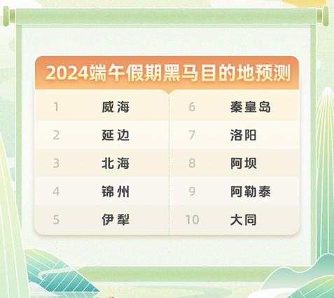 秦皇岛会成端午旅游“黑马”吗 同程旅行报告显示,2024年端午假期,出行市场以中短途为主,上海、北京、广州等中心城市开往周边小城市特别是县级城市的车票预订热度较平日增长2倍以上。历史博物馆参观、龙舟观赛体验、非遗文化体验、历史文化景区打卡、汉服妆造体验等各类深度体验中国历史文化的“新中式”旅行受到年轻用户关注。阿勒泰、秦皇岛入围黑马城市预测。