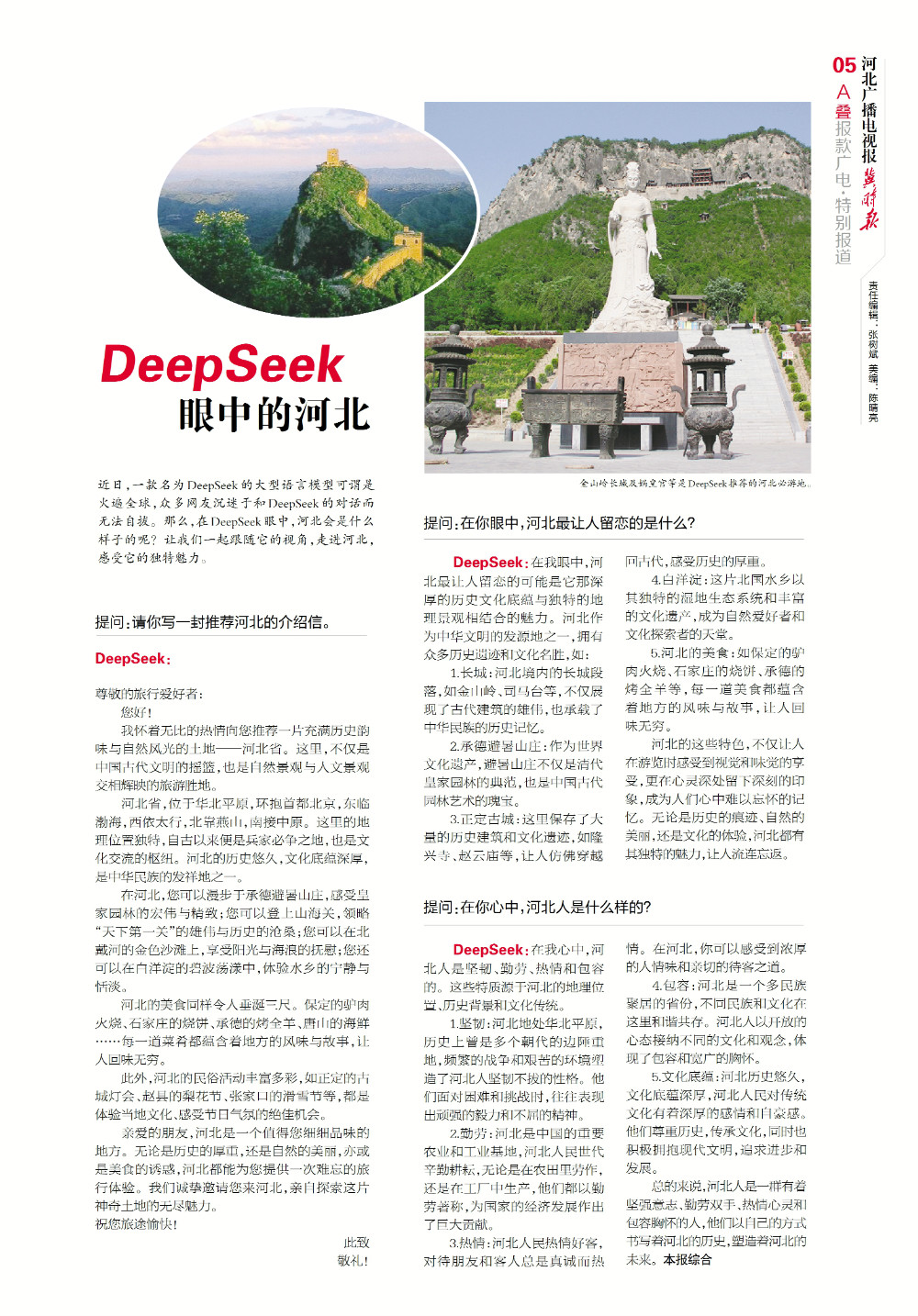 近日,一款名为DeepSeek的大型语言模型可谓是火遍全球,众多网友沉迷于和DeepSeek的对话而无法自拔。那么,在DeepSeek眼中,河北会是什么样子的呢?让我们一起跟随它的视角,走进河北,感受它的独特魅力。