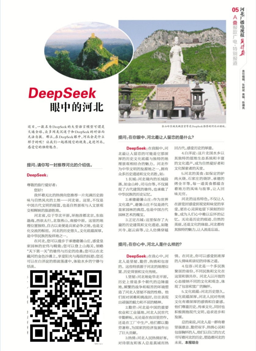 DeepSeek眼中的河北 近日,一款名为DeepSeek的大型语言模型可谓是火遍全球,众多网友沉迷于和DeepSeek的对话而无法自拔。那么,在DeepSeek眼中,河北会是什么样子的呢?让我们一起跟随它的视角,走进河北,感受它的独特魅力(识别图片上的二维码关注阅览)。