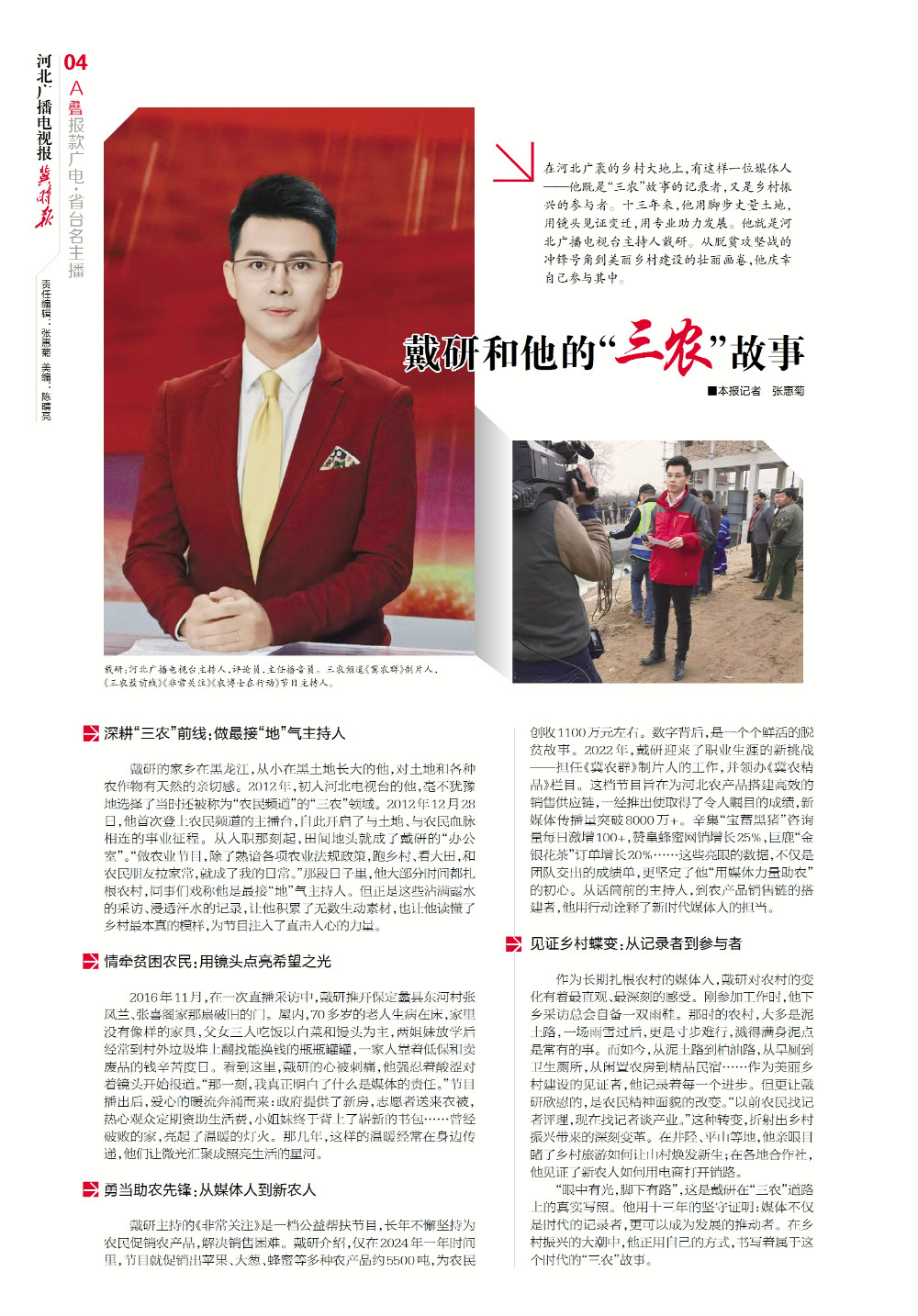 戴研主持的《非常关注》是一档公益帮扶节目,长年不懈坚持为农民促销农产品,解决销售困难。戴研介绍,仅在2024年一年时间里,节目就促销出苹果、大葱、蜂蜜等多种农产品约5500吨,为农民创收1100万元左右。数字背后,是一个个鲜活的脱贫故事。2022年,戴研迎来了职业生涯的新挑战——担任《冀农群》制片人的工作,并领办《冀农精品》栏目。这档节目旨在为河北农产品搭建高效的销售供应链,一经推出便取得了令人瞩目的成绩,新媒体传播量突破8000万+。辛集“宝蓄黑猪”咨询量每日激增100+,赞皇蜂蜜网销增长25%,巨鹿“金银花茶”订单增长20%……这些亮眼的数据,不仅是团队交出的成绩单,更坚定了他“用媒体力量助农”的初心。从话筒前的主持人,到农产品销售链的搭建者,他用行动诠释了新时代媒体人的担当。