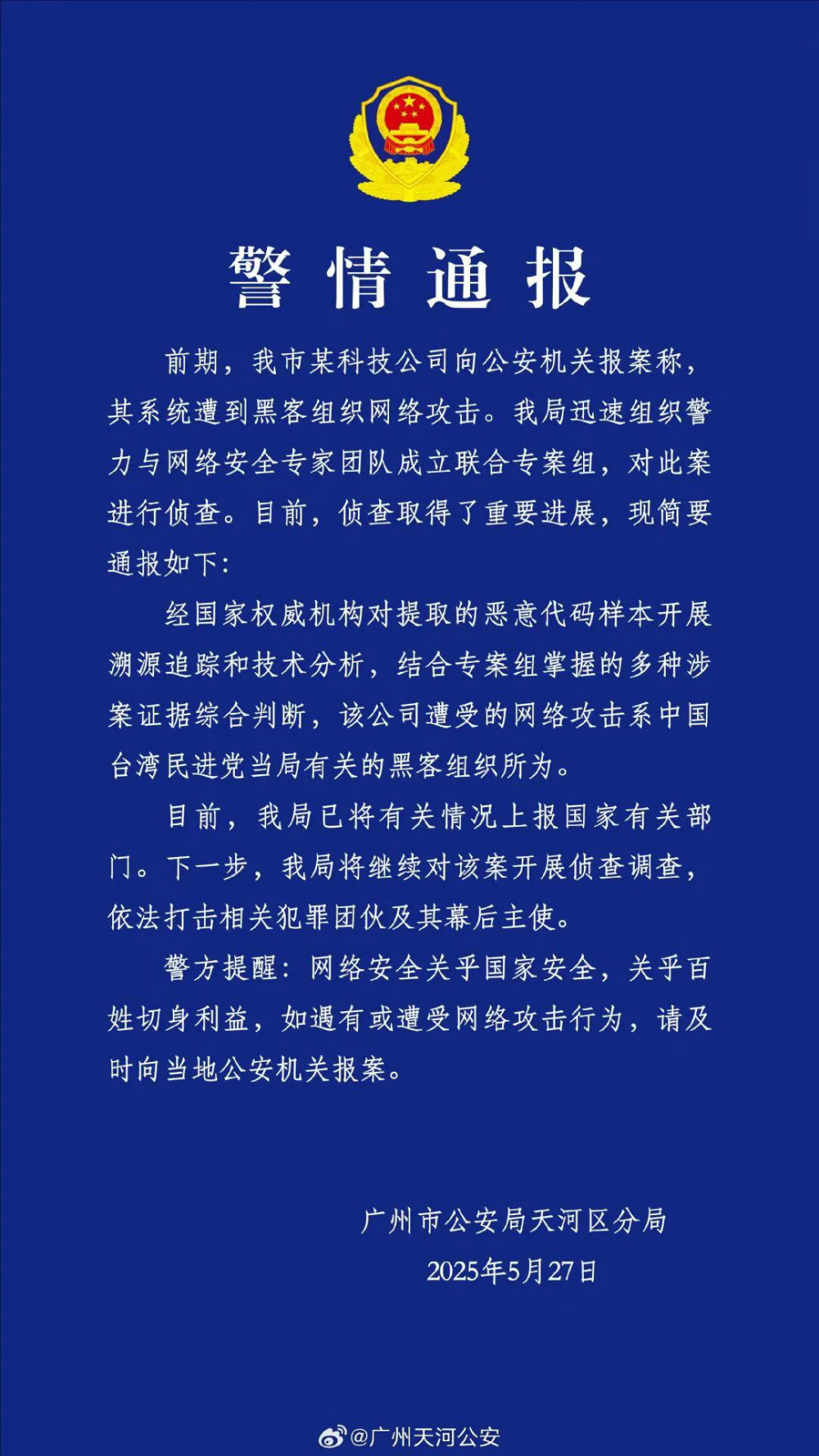 查明了!系中国台湾民进党当局豢养黑客所为 5月20日,广州市公安局天河区分局发布《警情通报》称,广州某科技公司遭境外黑客组织网络攻击,公安机关立即开展调查,提取相关攻击程序样本,全面固定相关涉案证据,并组织专业技术团队开展技术溯源。近日,记者从广州市公安局天河区分局了解到,公安机关高度重视此次境外黑客组织网络攻击事件,立即组织技术团队对提取的攻击程序和系统日志进行技术分析和溯源追踪,初步查明该公司遭受的网络攻击系中国台湾民进党当局豢养的黑客组织所为。