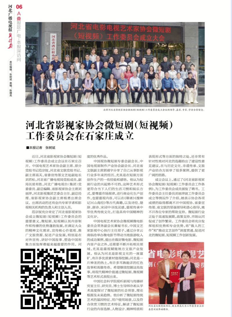 河北省影视家协会微短剧(短视频)工作委员会在石家庄成立 成立会议上,通过了《河北省影视家协会微短剧(短视频)工作委员会工作条例》,为工作委员会成员颁发了聘书。作委员会将充分发挥组织优势和专业优势,将“做人的工作”和“推动文艺创作”深度贯通,促进河北的微短剧、短视频工作创新发展(识别图片上的二维码关注阅览)。
