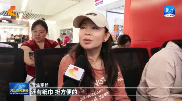 考生家长:这儿挺好,还有水、扇子什么的,还有纸巾,挺方便的。
