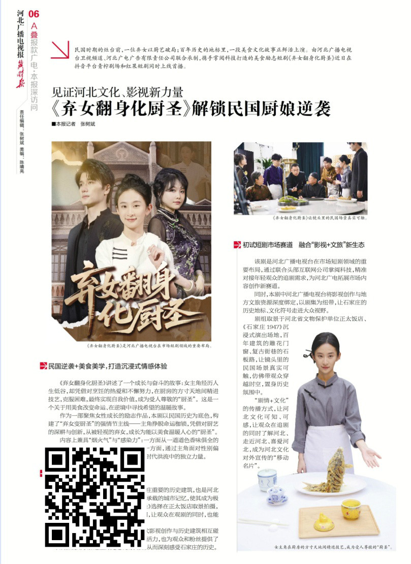 《弃女翻身化厨圣》:解锁民国厨娘逆袭,见证河北文化、影视新力量 民国时期的灶台前,一位弃女以厨艺破局;百年历史的地标里,一段美食文化故事正鲜活上演。由河北广播电视台卫视频道、河北广电广告有限责任公司联合承制,携手掌阅科技打造的美食励志短剧《弃女翻身化厨圣》近日在抖音平台青柠剧场和红果短剧同时上线首播(识别图片上的二维码关注阅览)。