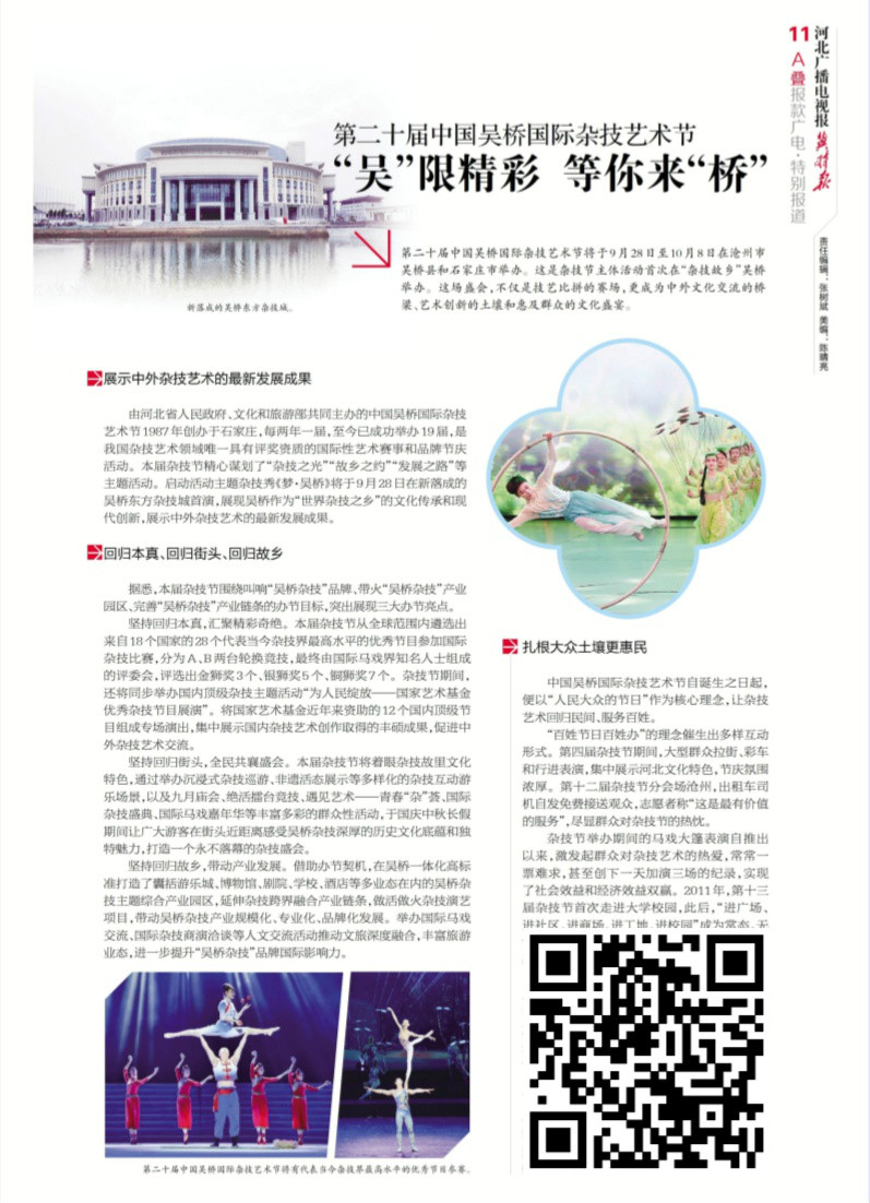 第二十届中国吴桥国际杂技艺术节——“吴”限精彩 等你来“桥” 第二十届中国吴桥国际杂技艺术节于9月28日至10月8日在沧州市吴桥县和石家庄市举办。这是杂技节主体活动首次在“杂技故乡”吴桥举办。这场盛会,不仅是技艺比拼的赛场,更成为中外文化交流的桥梁、艺术创新的土壤和惠及群众的文化盛宴(识别图片上的二维码关注阅览)。
