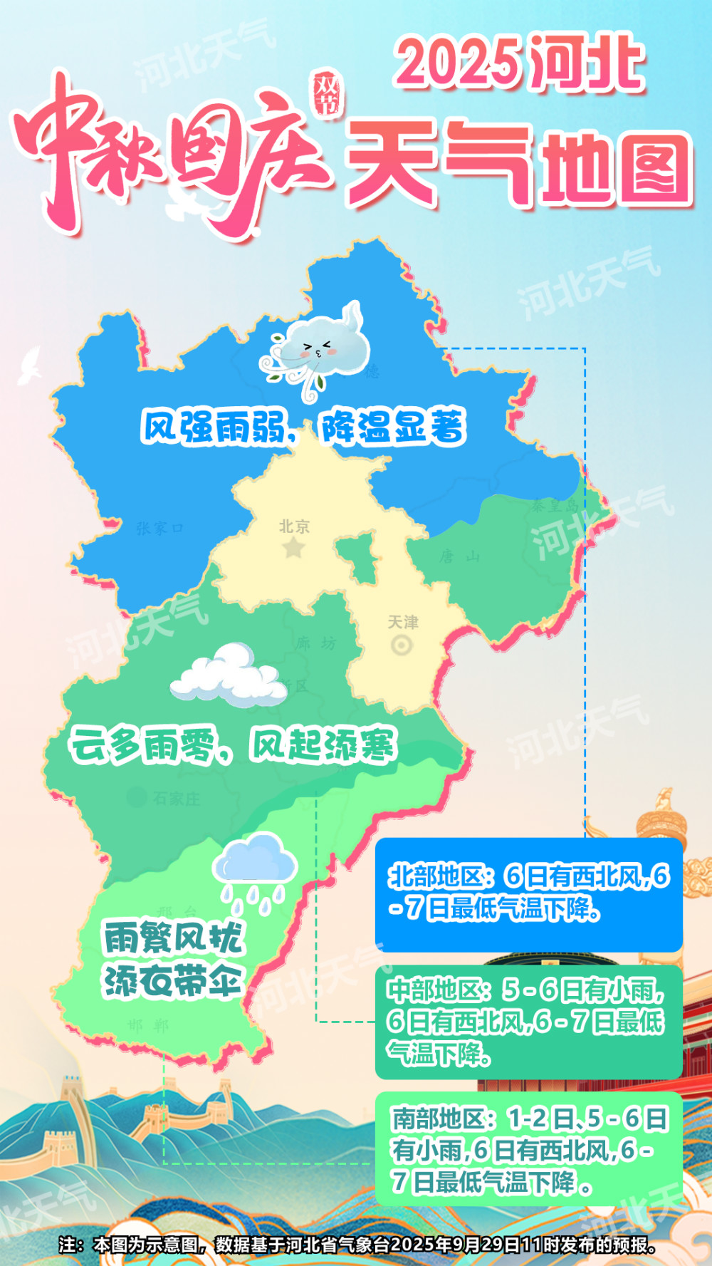 10月1日夜间到2日,石家庄、沧州以南地区阴有小雨或零星小雨转多云,个别地点有中雨,其他地区晴间多云。5-6日,全省大部分地区有小雨或零星小雨。6-7日,全省大部分地区最低气温下降8~10℃。