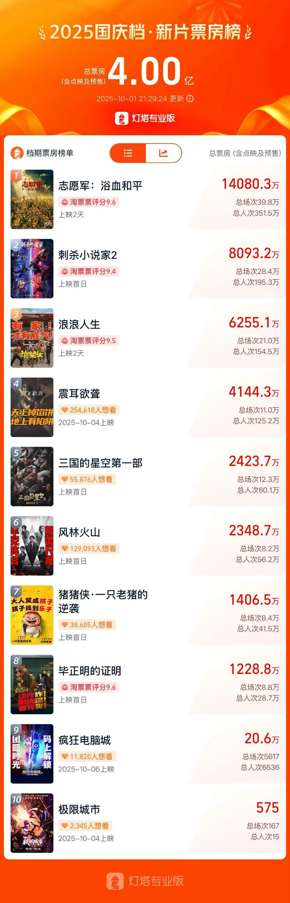2025国庆首日电影票房破4亿元 2025年国庆档电影市场热闹非凡。截至10月1日,已有13部新片上映。涵盖历史战争、奇幻冒险、家庭喜剧等多元类型。据网络平台数据,截至10月1日21时29分,2025国庆档新片票房突破4亿元,《志愿军:浴血和平》《刺杀小说家2》《浪浪人生》分列国庆档新片票房榜前三位。