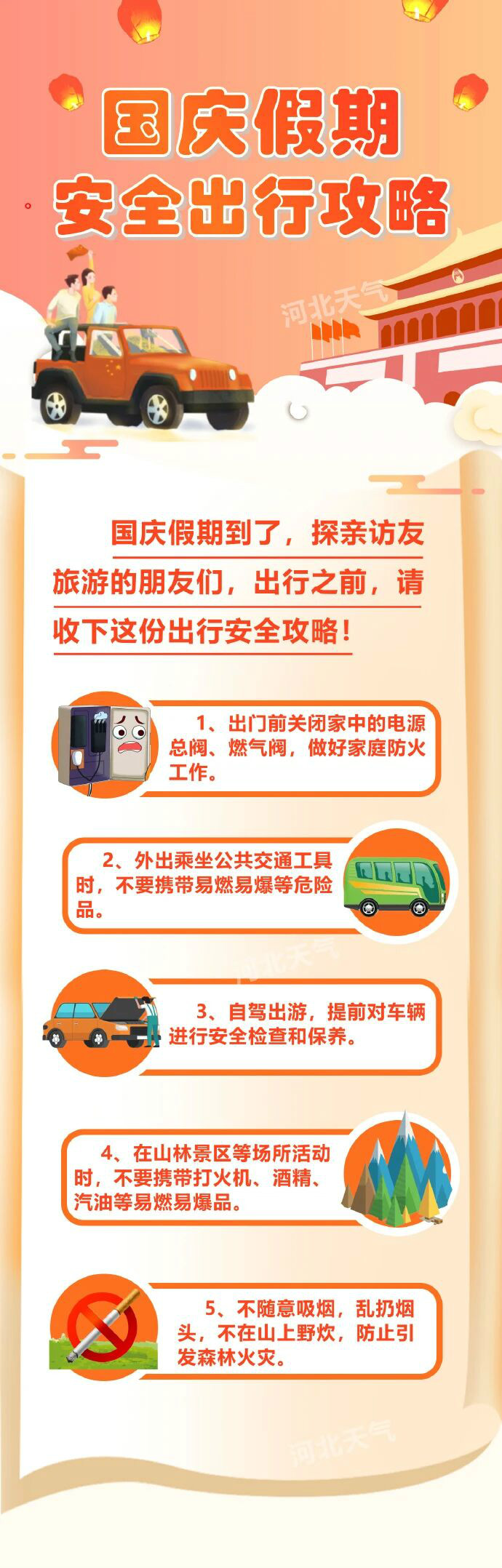 河北省文化和旅游厅发布国庆中秋假期出游提示:关注旅游安全 践行文明出游 近日,河北省文化和旅游厅发布国庆中秋假期出游提示,提醒广大游客关注旅游安全,践行文明出游。游客出行前要提前了解途经地和目的地天气、交通及旅游景区开放情况和门票预约措施,规划好旅游线路和时间。合理规划出行安排,尽量避开客流高峰期,科学规避交通拥堵路段和时段。不前往没有正式开发开放、缺乏安全保障的区域游玩。密切关注出境旅游目的地安全形势和注意事项,不前往高风险地区。