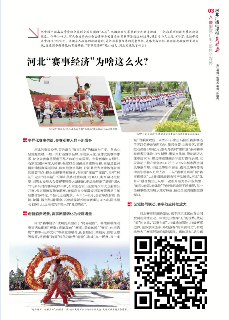 河北“赛事经济”为啥这么火? 今年1—8月,河北全省面向社会公开举办的各类体育赛事活动达8032场,吸引参与人次近1879万,直接带动消费超过370亿元。这组令人振奋的数据背后,是河北赛事经济的蓬勃生机,是体育与文化、旅游深度融合的生动实践,更是消费新动能的有效释放(识别图片上的二维码关注阅览)。