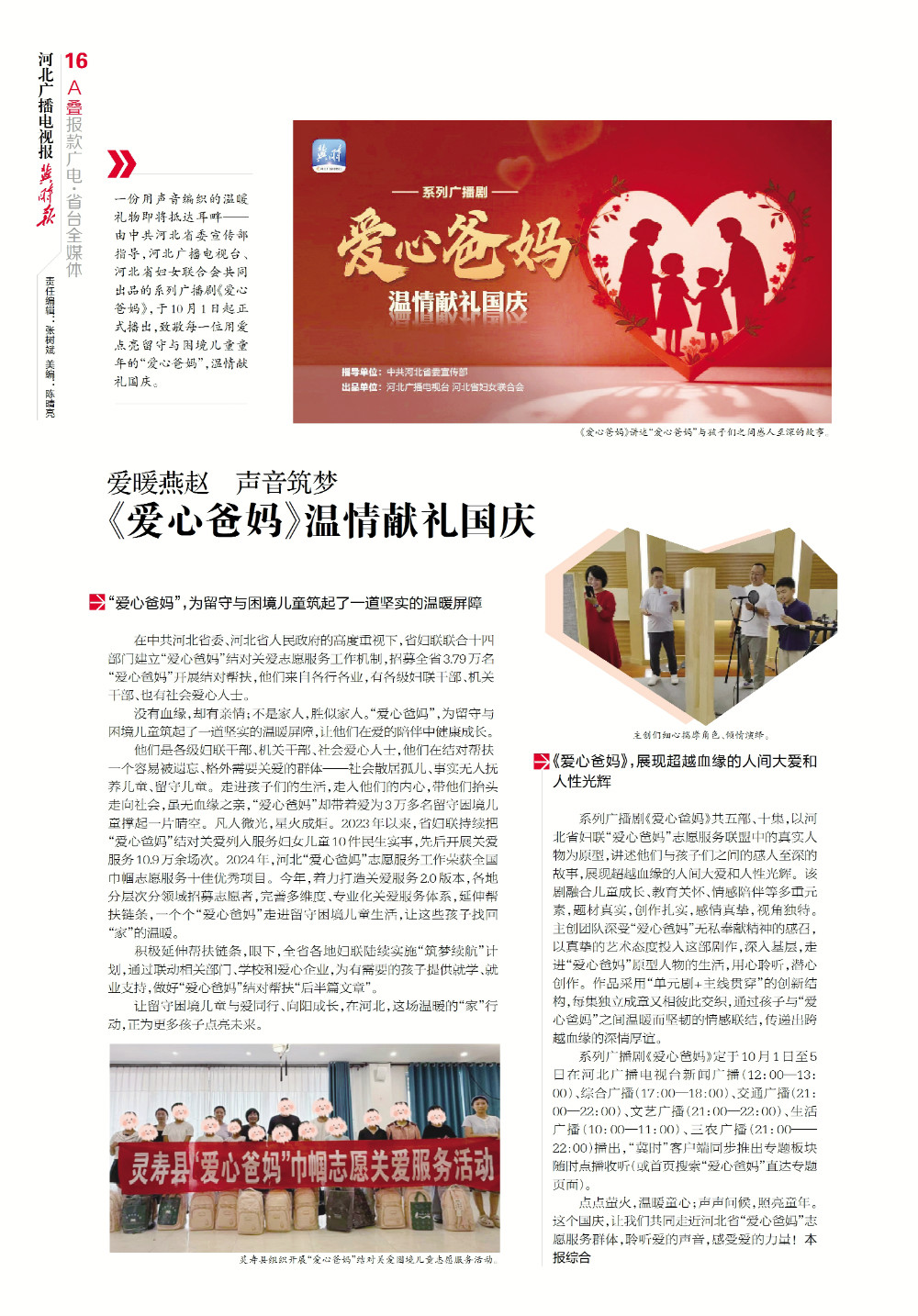 一份用声音编织的温暖礼物即将抵达耳畔——由中共河北省委宣传部指导,河北广播电视台、河北省妇女联合会共同出品的系列广播剧《爱心爸妈》,将于10月1日起正式播出,致敬每一位用爱点亮留守与困境儿童童年的“爱心爸妈”,温情献礼国庆。