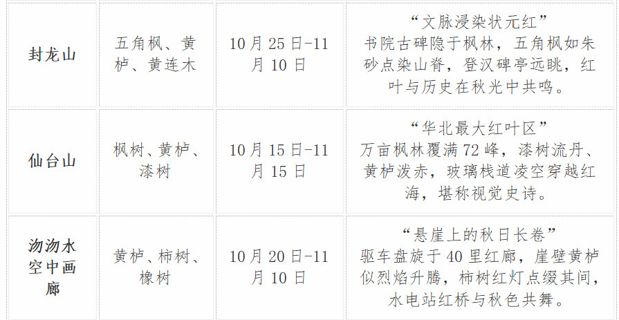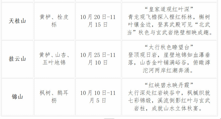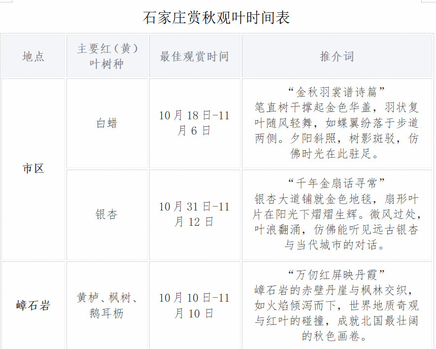 石家庄赏秋观叶时间表来了!最佳观赏时间从10月中旬开始 10月的石家庄秋意更浓,西部太行山的叶子悄然变色,据石家庄市气象局预测,今年红叶的最佳观赏期将从10月中旬开始,持续到11月上旬,市民可在天气适宜的情况下出游观赏。据石家庄市气象台最新预报,10月10日至12日石家庄市还将有降雨出现,气象部门提醒市民出行要及时关注天气情况,携带好雨具,可在10月13日天气放晴之际,出行赏秋观叶,享受大自然带来的视觉盛宴。