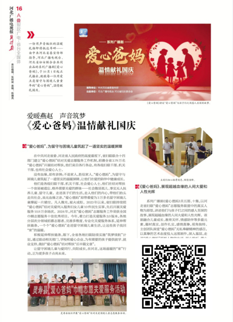 系列广播剧《爱心爸妈》——致敬每一位用爱点亮留守与困境儿童童年的“爱心爸妈” 系列广播剧《爱心爸妈》共五部、十集,以河北省妇联“爱心爸妈”志愿服务联盟中的真实人物为原型,讲述他们与孩子们之间的感人至深的故事,展现超越血缘的人间大爱和人性光辉。该剧融合儿童成长、教育关怀、情感陪伴等多重元素,题材真实,创作扎实,感情真挚、视角独特(识别图片上的二维码关注阅览)。