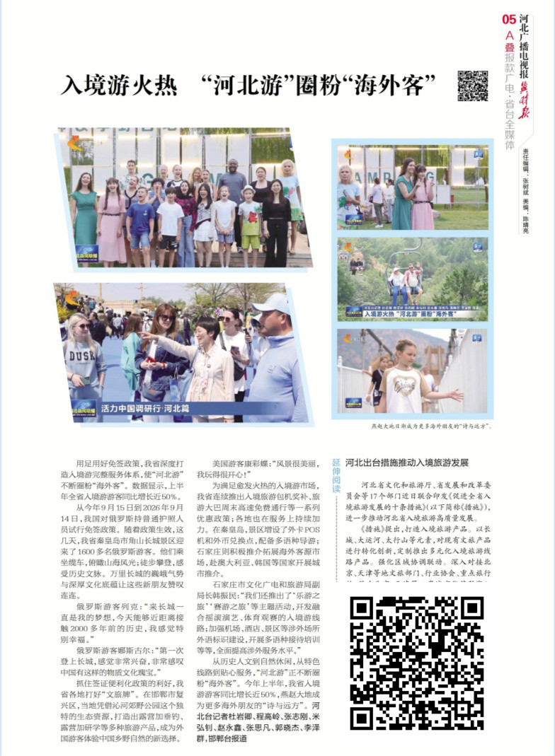 入境游火热 “河北游”圈粉“海外客” 用足用好免签政策,我省深度打造入境游完整服务体系,使“河北游”不断圈粉“海外客”。数据显示,上半年全省入境游游客同比增长近50%(识别图片上的二维码关注阅览)。