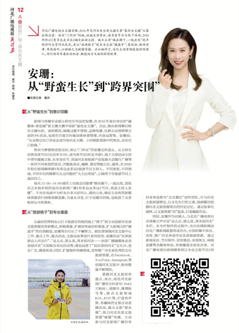 省台名主播丨安珊:从“野蛮生长”到“跨界突围” 河北广播电视台主播安珊,2016年凭河北电台新主播大赛“最佳女主播”从幕后转台前。初为“门外汉”的她,试遍生活资讯、读书类节目与线下活动,2020年终以《有多远走多远》锚定旅游主持。她不止用“路在脚下,一起出发”的声线伴听众赏河北风光,更从“旅游搭子”蜕变为文旅“操盘手”:策划IP、联动京津、布局海外,以融媒之力破圈传播。正如她所言,这位主动重构技能的传媒人,用行动书写着抓住机会、赋能地方文旅的转型故事(识别图片上的二维码关注阅览)。