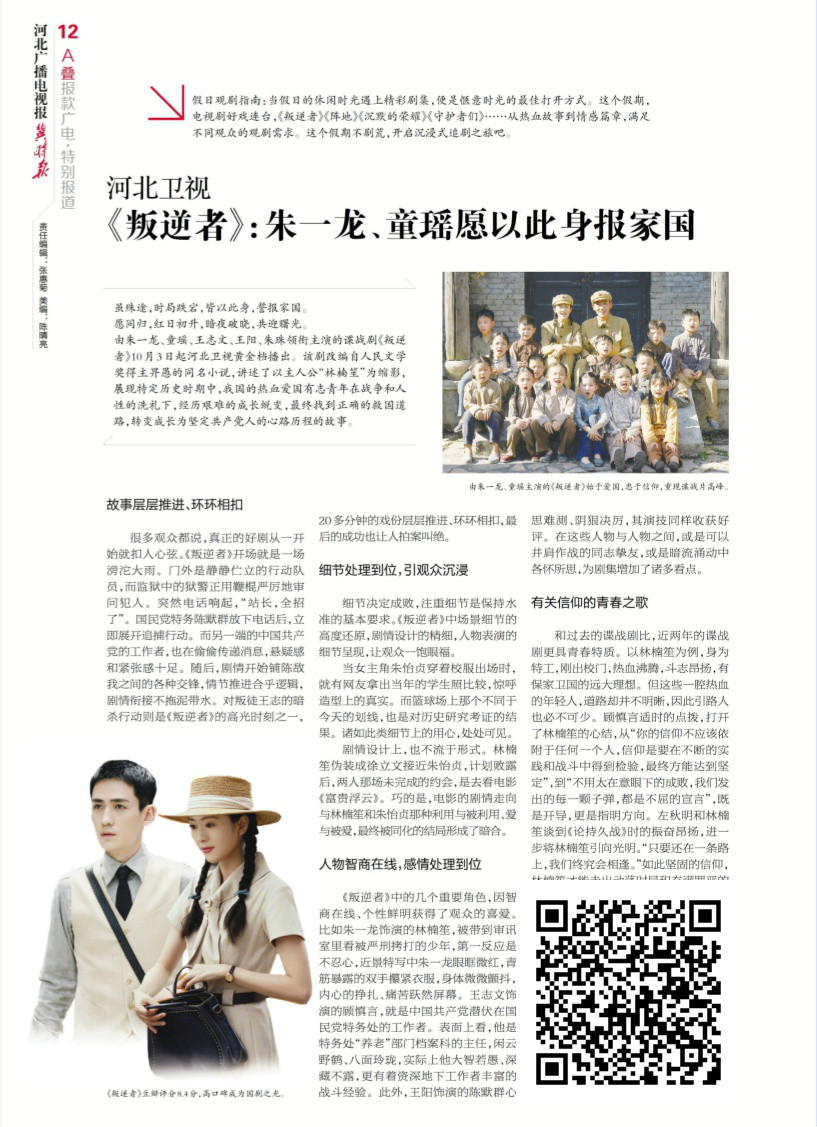 《叛逆者》河北卫视热播:朱一龙、童瑶愿以此身报家国 该剧改编自人民文学奖得主畀愚的同名小说,讲述了以主人公“林楠笙”为缩影,展现特定历史时期中,我国的热血爱国有志青年在战争和人性的洗礼下,经历艰难的成长蜕变,最终找到正确的救国道路,转变成长为坚定共产党人的心路历程的故事(识别图片上的二维码关注阅览)。