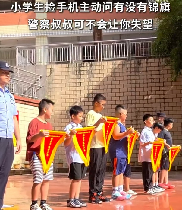 小学生捡手机主动问有没有锦旗 近日,云南红河河口县,8名小学生捡到一部手机后主动上交至派出所,还好奇发问:“会不会表扬我们?会给锦旗吗?”一周后,民警特地前往学校为他们举行了一场特别的表彰仪式。