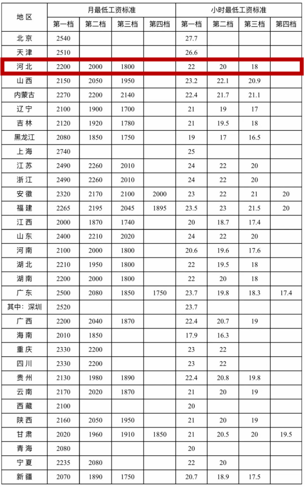 明确了!河北工资不能低于这个数 10月17日,人社部官网公布全国各省、自治区、直辖市最低工资标准情况(截至2025年10月1日)。根据劳动法第四十八条规定,国家实行最低工资保障制度。最低工资的具体标准由省、自治区、直辖市人民政府规定,报国务院备案。用人单位支付劳动者的工资不得低于当地最低工资标准。根据《最低工资规定》规定,最低工资标准是指劳动者在法定工作时间或依法签订的劳动合同约定的工作时间内提供了正常劳动的前提下,用人单位依法应支付的最低劳动报酬。