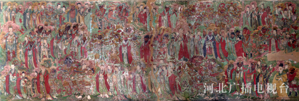 辽金时期壁画尽显民族融合特色,宣化辽墓“茶道图”“散乐图”中,契丹族“髡发”与汉族“交领衫”同框,生动诠释文化交融;井陉金墓“耕获图”“捣练图”充满生活气息,成为民间绘画典范。明代石家庄毗卢寺壁画尤为璀璨夺目,“三界诸神图”涵盖500多位佛道儒人物,融合多种描法与沥粉贴金工艺,展现多元文化共生独特价值。