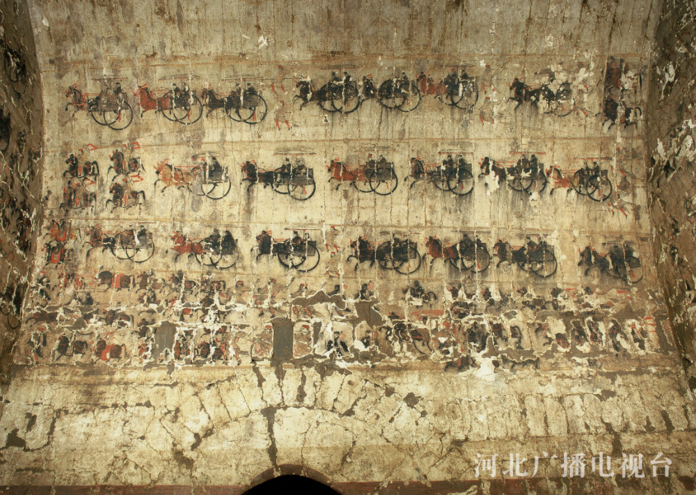 作为中国北方古代壁画遗存最丰富的聚集地之一,河北壁画形成完整历史序列,填补中国绘画史诸多空白。展览以时代为轴分为九个展区,系统呈现壁画从汉代写实叙事到明清世俗化的风格转型。其中,各时期巅峰之作集中亮相:东汉安平逯家庄汉墓“车马出行图”气势恢宏,院落建筑图是我国现存最早大型界画,“熹平五年”纪年题记赋予其重要学术价值;磁县湾漳北齐皇陵320平方米仪仗图,以与真人等高的细腻刻画,代表北朝宫廷绘画最高水准;曲阳五代王处直墓壁画的皴法与构图,可与传世名家画作印证,是早期山水画重要实物。