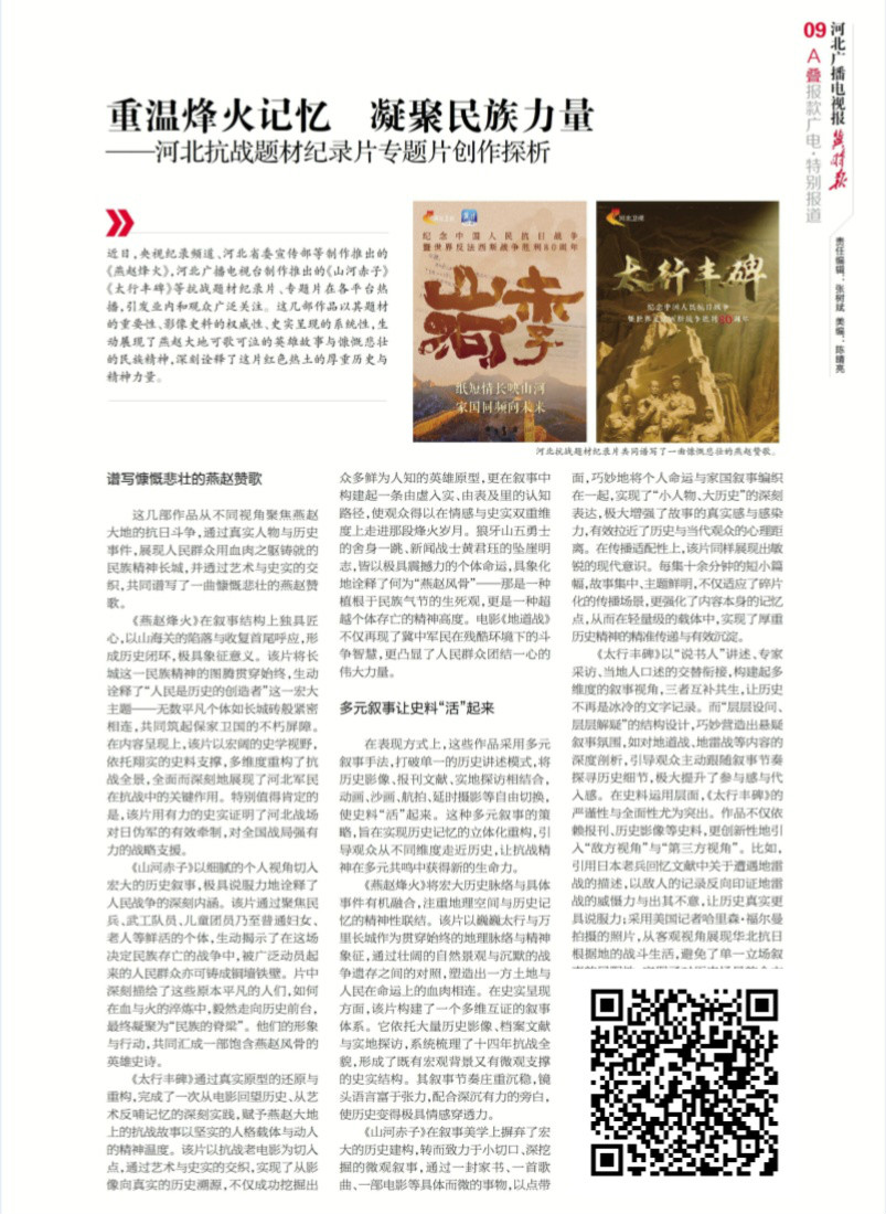 重温烽火记忆 凝聚民族力量——河北抗战题材纪录片专题片创作探析 近日,央视纪录频道、河北省委宣传部等制作推出的《燕赵烽火》,河北广播电视台制作推出的《山河赤子》《太行丰碑》等抗战题材纪录片、专题片在各平台热播,引发业内和观众广泛关注。这几部作品以其题材的重要性、影像史料的权威性、史实呈现的系统性,生动展现了燕赵大地可歌可泣的英雄故事与慷慨悲壮的民族精神,深刻诠释了这片红色热土的厚重历史与精神力量(识别图片上的二维码关注阅览)。