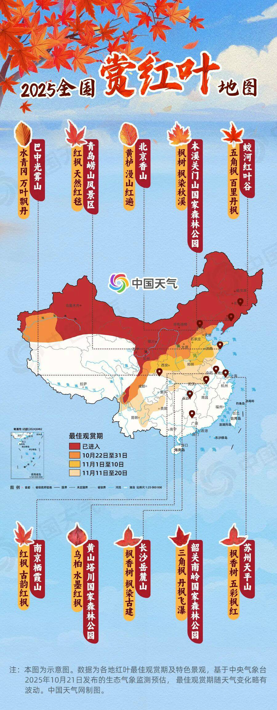 京津冀等地红叶最佳观赏期将开启 从中国天气网推出的2025全国赏红叶地图来看,截至10月21日,新疆大部、内蒙古大部、陕西中北部、宁夏、甘肃大部、东北地区、华北北部等地已进入红叶最佳观赏期。10月下旬,北京中南部、天津北部、河北中部、山西中南部、陕西中部、四川西北部等地也即将层林尽染;11月上旬,河北南部、山东中西部、河南北部、陕西南部、甘肃东南部等地的红叶将陆续上妆。华北、黄淮等地的红叶观赏季即将开启,其中北京大部地区红叶将在10月底进入最佳观赏期。