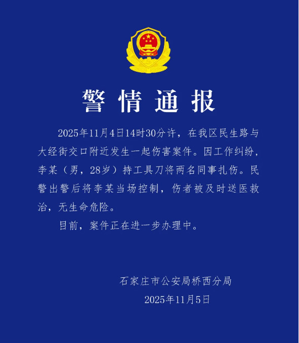 11月5日,河北石家庄市桥西分局警方通报:11月4日14时30分许,在该区民生路与大经街交口附近发生一起伤害案件。因工作纠纷,李某(男,28岁)持工具刀将两名同事扎伤。民警出警后将李某当场控制,伤者被及时送医救治,无生命危险。(石家庄桥西公安)