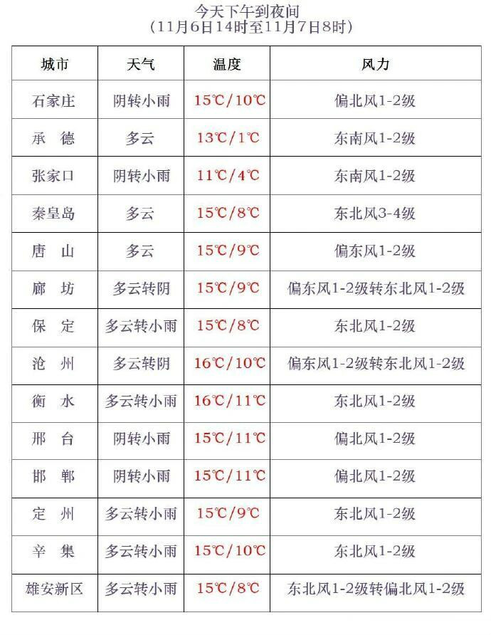 今天下午到夜间,张家口、保定、雄安新区、廊坊南部、石家庄、沧州西部、衡水、邢台、邯郸阴有小雨或零星小雨,其中张家口北部有雨夹雪或小雪,其他地区多云。最高气温,张家口、承德北部、保定西北部8~12℃,其他地区13~17℃。最低气温,张家口、承德、保定西北部-3~5℃,其他地区6~11℃。