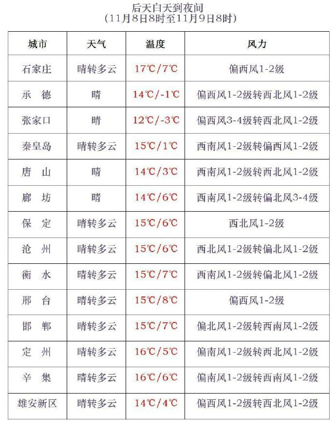 8日早晨到9日早晨,全省大部分地区最低气温累计下降3~5℃,局地下降6~8℃。(河北天气)