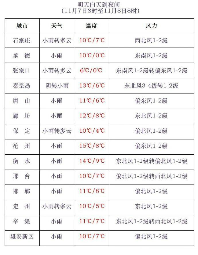 明天夜间到8日,张家口东部、承德、唐山、秦皇岛、保定东部、雄安新区、廊坊、石家庄东部、沧州、衡水、邢台、邯郸阴有小雨转多晴,其中坝上地区阴有雨夹雪或小雪转云;其他地区多云转晴。