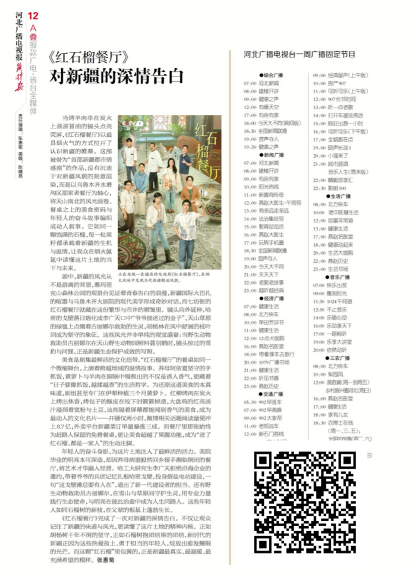 GDB评论|《红石榴餐厅》:对新疆的深情告白 《红石榴餐厅》完成了一次对新疆的深情告白。不仅让观众记住了新疆的味道与风光,更读懂了这片土地的精神内核。正如胡杨树千年不倒的坚守,正如石榴树抱团结果的团结,新时代的新疆正因为这些热爱故土、勇于担当的年轻人,绽放出愈发耀眼的光芒。而这颗“红石榴”里包裹的,正是新疆最真实、最温暖、最充满希望的模样(识别图片上的二维码关注阅览)。