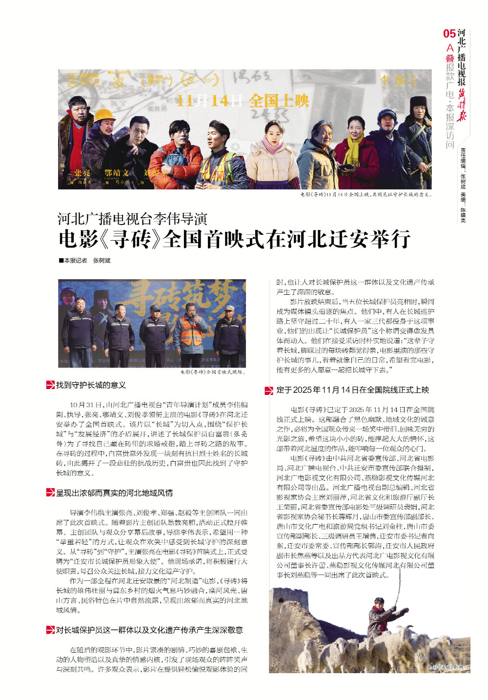 国+社区新媒体报道 10月31日,由河北广播电视台“青年导演计划”成员李伟编剧、执导,张亮、鄂靖文、刘俊孝领衔主演的电影《寻砖》在河北迁安举办了全国首映式。该片是一部响应习近平总书记“长城文化”指示精神的作品,以“长城”为切入点,围绕“保护长城”与“发展经济”的矛盾展开,讲述了长城保护员白富贵(张亮饰演)为了寻找自己藏在砖里的求婚戒指,踏上寻砖之路的故事。在寻砖的过程中,白富贵意外发现一块刻有抗日烈士姓名的长城砖,由此揭开了一段悲壮的抗战历史,白富贵也因此找到了守护长城的意义。