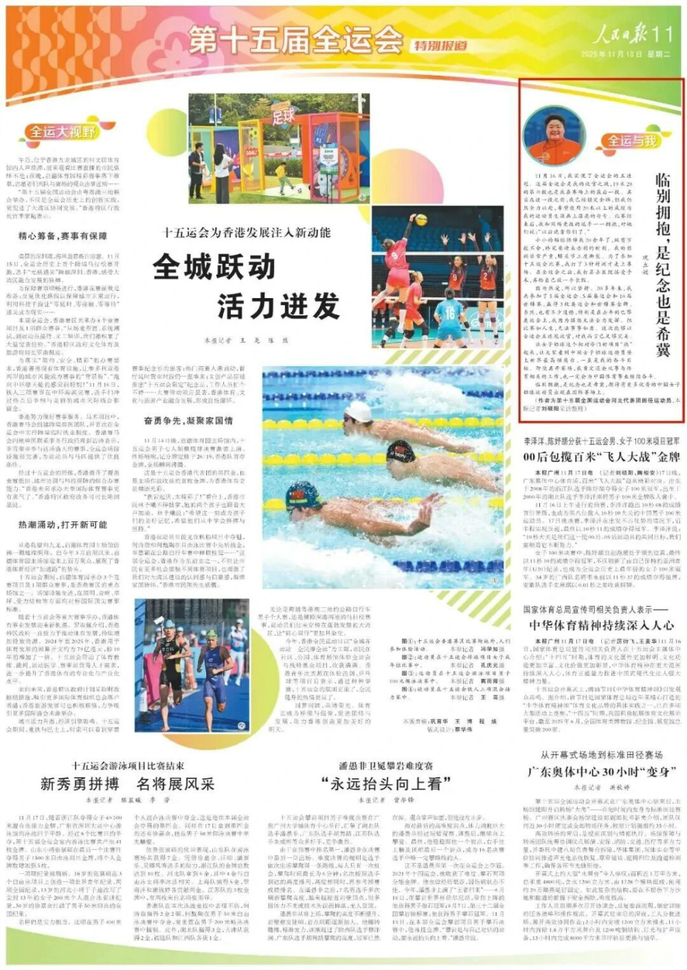 《人民日报》11月18日第11版刊发第十五届全国运动会河北代表团田径运动员巩立姣文章《临别拥抱,是纪念也是希冀》。