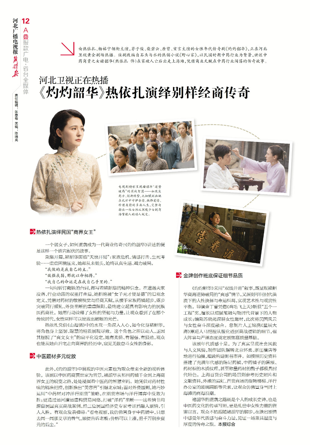 由热依扎、杨祐宁领衔主演,茅子俊、柴碧云、唐曾、宣言主演的女性年代传奇剧《灼灼韶华》,正在河北卫视黄金剧场热播。该剧改编自石头与水的热销小说《野心家》,以民国时期中药行业为背景,讲述中药商贾之女褚韶华(热依扎 饰)在家破人亡后出走上海滩,凭借商业天赋在中药行业闯荡的传奇故事。
