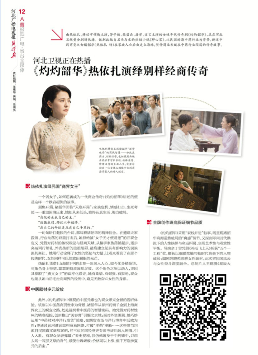 河北卫视正在热播——《灼灼韶华》热依扎演绎别样经商传奇 该剧改编自石头与水的热销小说《野心家》,以民国时期中药行业为背景,讲述中药商贾之女褚韶华(热依扎 饰)在家破人亡后出走上海滩,凭借商业天赋在中药行业闯荡的传奇故事(识别图片上的二维码关注阅览)。