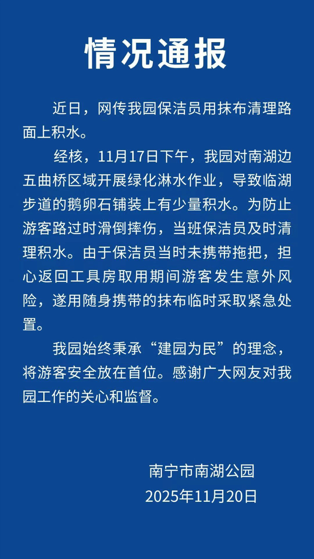 环卫阿姨被要求逐个清理石缝积水?公园通报! 近日,网传广西南宁市南湖公园要求保洁员用抹布逐个清理石缝积水。11月20日,南湖公园就此事发布情况通报:经核,11月17日下午,我园对南湖边五曲桥区域开展绿化淋水作业,导致临湖步道的鹅卵石铺装上有少量积水。为防止游客路过时滑倒摔伤,当班保洁员及时清理积水。由于保洁员当时未携带拖把,担心返回工具房取用期间游客发生意外风险,遂用随身携带的抹布临时采取紧急处置。