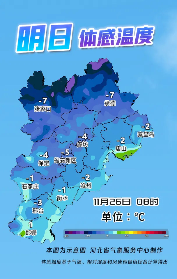 11月24日17时至25日17时,全省大部分地区最低气温下降4~7℃,其中张家口东北部、承德北部、保定中部、石家庄南部、衡水中部、邢台西部、邯郸中部等地区局地下降8~10℃。